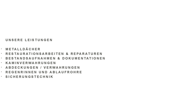Unsere Leistungen: Metalldächer, Restaurationsarbeiten und Reparaturen, Bestandsaufnahmen und Dokumentationen, Kaminverwahrungen, Abdeckungen / Verwahrungen, Regenrinnen und Ablaufrohre, Sicherungstechnik