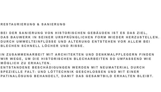 Durch Umwelteinflüsse und Alterung entstehen vor allem bei Blechen schnell Löcher und Risse. In Zusammenarbeit mit Architekten und Denkmalpflegern finden wir Wege, um die historischen Blecharbeiten so umfassend wie möglich zu erhalten.